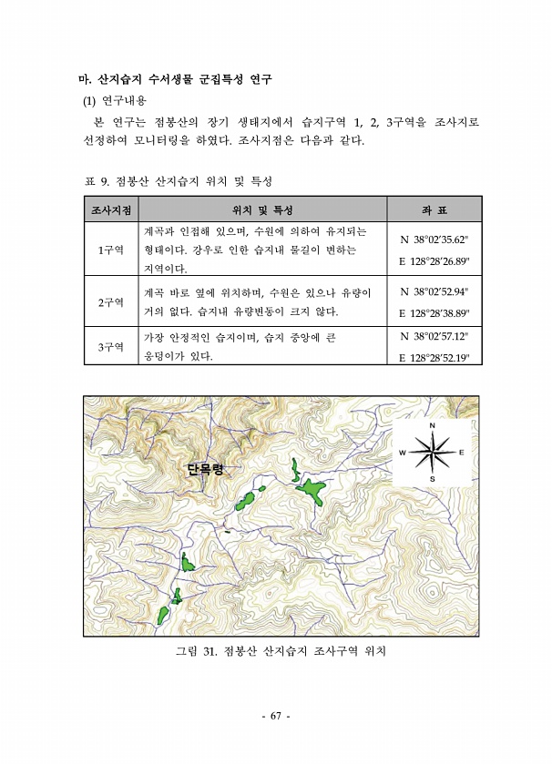 67 마. 산지습지 수서생물 군집특성 연구 1 연구내용 본 연구는 점봉산의 장기 생태지에서 습지구역 1, 2, 3구역을 조사지로 선정하여 모니터링을 하였다. 조사지점은 다음과 같다. 조사지점 위치 및 특성 좌 표 1구역 계곡과 인접해 있으며, 수원에 의하여 유지되는 형태이다. 강우로 인한 습지내 물길이 변하는 지역이다. N 38°0235.62E 128°2826.892구역 계곡 바로 옆에 위치하며, 수원은 있으나 유량이 거의 없다. 습지내 유량변동이 크지 않다. N 38°0252.94E 128°2838.893구역 가장 안정적인 습지이며, 습지 중앙에 큰 웅덩이가 있다. N 38°0257.12E 128°2852.19표 9. 점봉산 산지습지 위치 및 특성 그림 31. 점봉산 산지습지 조사구역위치