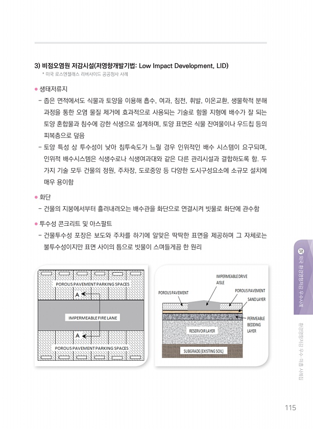 Ⅳ 외국 환경영향저감 우수사례 환경영향저감 우수·미흡 사례집 115 3 비점오염원 저감시설 저영향개발기법Low Impact Development, LID ● 생태저류지 좁은 면적에서도 식물과 토양을 이용해 흡수, 여과, 침전, 휘발, 이온교환, 생물학적 분해 과정을 통한 오염 물질 제거에 효과적으로 사용되는 기술로 함몰 지형에 배수가 잘 되는 토양 혼합물과 침수에 강한 식생으로 설계하며, 토양 표면은 식물 잔여물이나 우드칩 등의 피복층으로 덮음 토양 특성 상 투수성이 낮아 침투속도가 느릴 경우 인위적인 배수 시스템이 요구되며, 인위적 배수시스템은 식생수로나 식생여과대와 같은 다른 관리시설과 결합하도록 함. 두 가지 기술 모두 건물의 정원, 주차장, 도로중앙 등 다양한 도시구성요소에 소규모 설치에 매우 용이함...