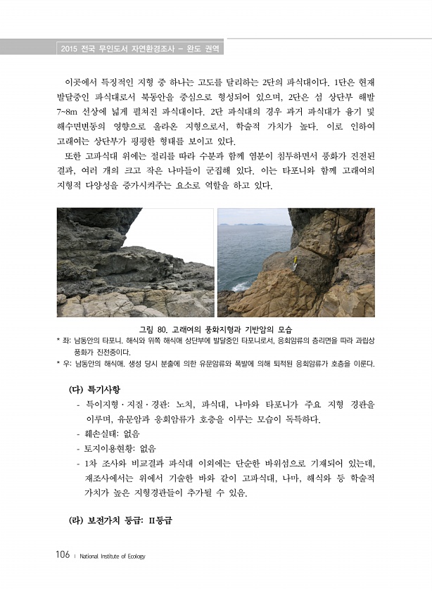 2015 전국 무인도서 자연환경조사 완도 권역 106 ? National Institute of Ecology 이곳에서 특징적인 지형 중 하나는 고도를 달리하는 2단의 파식대이다. 1단은 현재 발달중인 파식대로서 북동안을 중심으로 형성되어 있으며, 2단은 섬 상단부 해발 78m 선상에 넓게 펼쳐진 파식대이다. 2단 파식대의 경우 과거 파식대가 융기 및 해수면변동의 영향으로 올라온 지형으로서, 학술적 가치가 높다. 이로 인하여 고래여는 상단부가 평평한 형태를 보이고 있다. 또한 고파식대 위에는 절리를 따라 수분과 함께 염분이 침투하면서 풍화가 진전된 결과, 여러 개의 크고 작은 나마들이 군집해 있다. 이는 타포니와 함께 고래여의 지형적 다양성을 증가시켜주는 요소로 역할을 하고 있다. 그림 80. 고래여의 풍화...