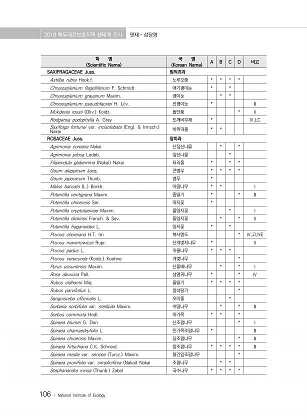 2018 백두대간보호지역 생태계 조사 댓재 삽당령 106 ? National Institute of Ecology 학 명 Scientific Name 국 명 Korean Name A B C D 비고 SAXIFRAGACEAE Juss. 범의귀과 Astilbe rubra Hook.f. 노루오줌 * * * * Chrysosplenium flagelliferum F. Schmidt 애기괭이눈 * * Chrysosplenium grayanum Maxim. 괭이눈 * * Chrysosplenium pseudofauriei H. L?v. 선괭이눈 * Ⅲ Mukdenia rossii Oliv. Koidz. 돌단풍 * Ⅱ Rodgersia podophylla A. Gray 도깨비부채 * Ⅳ,LC Saxifraga fortu...