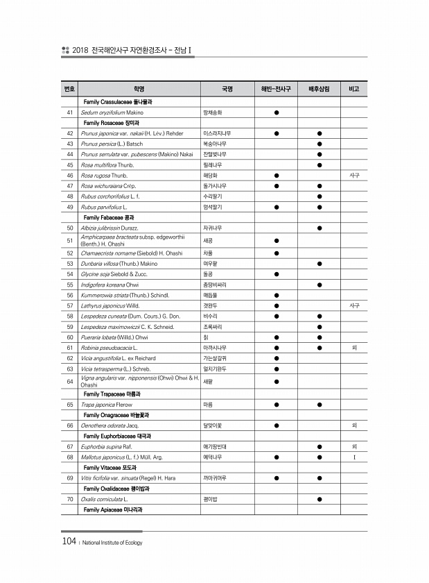 2018 전국해안사구 자연환경조사 전남Ⅰ 104 ? National Institute of Ecology 번호 학명 국명 해빈-전사구 배후삼림 비고 Family Crassulaceae 돌나물과 41 Sedum oryzifolium Makino 땅채송화 ● Family Rosaceae 장미과 42 Prunus japonica var. nakaii H. L?v. Rehder 이스라지나무 ● ● 43 Prunus persica L. Batsch 복숭아나무 ● 44 Prunus serrulata var. pubescens Makino Nakai 잔털벚나무 ● 45 Rosa multiflora Thunb. 찔레나무 ● 46 Rosa rugosa Thunb. 해당화 ● 사구 47 Rosa wichuraiana Cr?p...