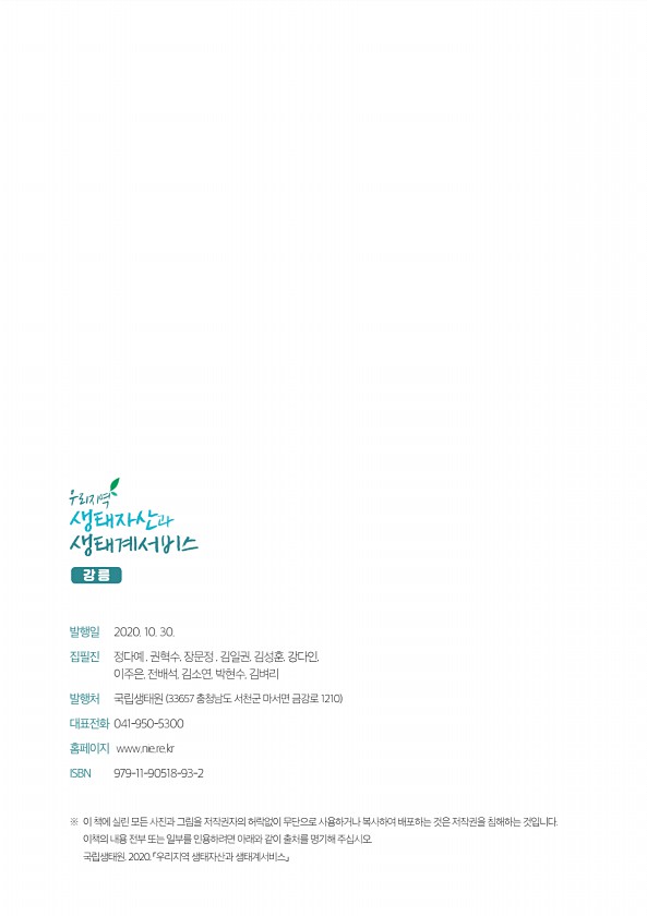 강 릉 생태계서비스 우리지역 생태자산과 발행일 2020. 10. 30. 집필진 정다예 , 권혁수, 장문정 , 김일권, 김성훈, 강다인, 이주은, 전배석, 김소연, 박현수, 김벼리 발행처 국립생태원 33657 충청남도 서천군 마서면 금강로 1210 대표전화 041-950-5300 홈페이지 www.nie.re.kr ISBN 979-11-90518-93-2 ※ 이 책에 실린 모든 사진과 그림을 저작권자의 허락없이 무단으로 사용하거나 복사하여 배포하는 것은 저작권을 침해하는것입니다. 이책의 내용 전부 또는 일부를 인용하려면 아래와 같이 출처를 명기해 주십시오. 국립생태원, 2020, 「우리지역 생태자산과생태계서비스」