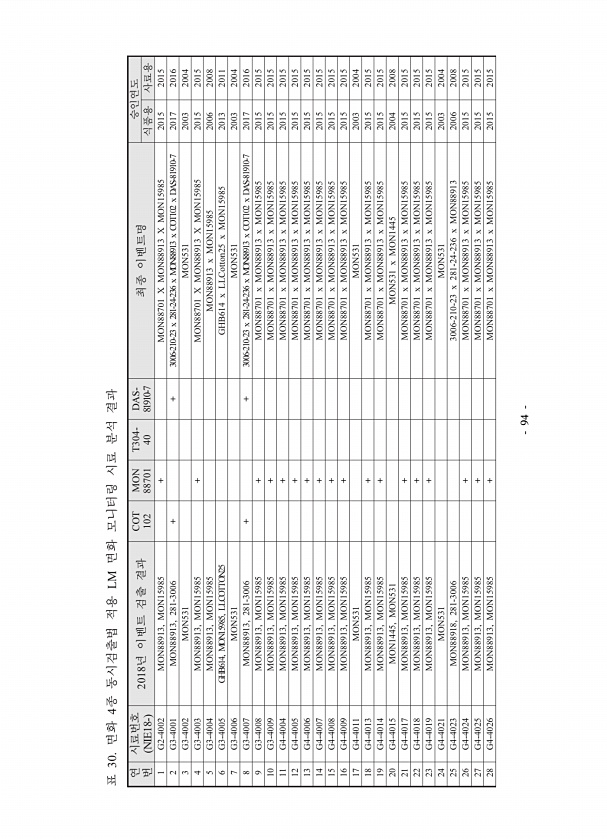 94 30. 4 LM NIE18- 2018 COT 102 88701 MON T304- 40 81910-7 DAS- 1 G2-4002 MON88913, MON15985 + MON88701 X MON88913 X MON15985 2015 2015 2 G3-4001 MON88913, 281-3006 + + 3006-210-23 x 281-24-236 x MON88913 x COT102 x DAS-81910-7 2017 2016 3 G3-4002 MON531 MON531 2003 2004 4 G3-4003 MON88913, MON15985 + MON88701 X MON88913 X MON15985 2015 2015 5 G3-4004 MON88913, MON15985 MON88913 x MON15985 2006 20...
