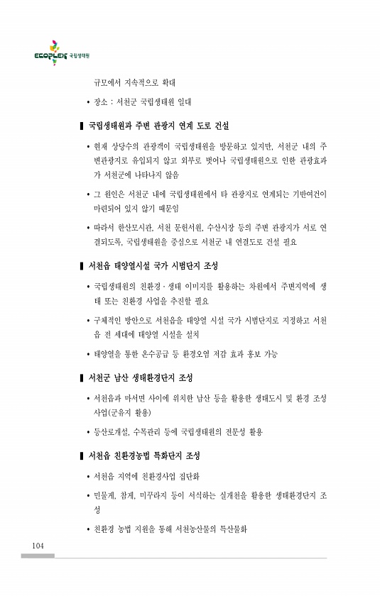 104 규모에서 지속적으로 확대 ? 장소 서천군 국립생태원 일대 ? 국립생태원과 주변 관광지 연계 도로 건설 ? 현재 상당수의 관광객이 국립생태원을 방문하고 있지만, 서천군 내의 주 변관광지로 유입되지 않고 외부로 벗어나 국립생태원으로 인한 관광효과 가 서천군에 나타나지 않음 ? 그 원인은 서천군 내에 국립생태원에서 타 관광지로 연계되는 기반여건이 마련되어 있지 않기 때문임 ? 따라서 한산모시관, 서천 문헌서원, 수산시장 등의 주변 관광지가 서로 연 결되도록, 국립생태원을 중심으로 서천군 내 연결도로 건설 필요 ? 서천읍 태양열시설 국가 시범단지 조성 ? 국립생태원의 친환경·생태 이미지를 활용하는 차원에서 주변지역에 생 태 또는 친환경 사업을 추진할 필요 ? 구체적인 방안으로 서천읍을 태양열 시설 국가 시범...