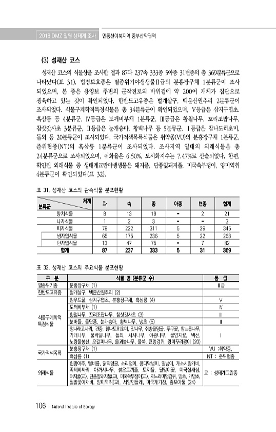 2018 DMZ 일원 생태계 조사 민통선이북지역 중부산악권역 106 ? National Institute of Ecology 3 성재산 코스 성재산 코스의 식물상을 조사한 결과 87과 237속 333종 5아종 31변종의 총 369분류군으로 나타났다 표 31 법정보호종은 멸종위기야생생물Ⅱ급의 분홍장구채 1분류군이 조사 되었으며, 본 종은 용양보 주변의 군작전로의 바위겉에 약 200여 개체가 집단으로 생육하고 있는 것이 확인되었다. 한반도고유종은 털개살구, 백운산원추리 2분류군이 조사되었다. 식물구계학적특정식물은 총 34분류군이 확인되었으며, Ⅴ등급은 삼지구엽초. 흑삼릉 등 4분류군, Ⅳ등급은 도깨비부채 1분류군, Ⅲ등급은 황철나무, 꼬리조팝나무, 참삿갓사초 3분류군, Ⅱ등급은 눈개승마, 황벽나무 등 5분류군,...