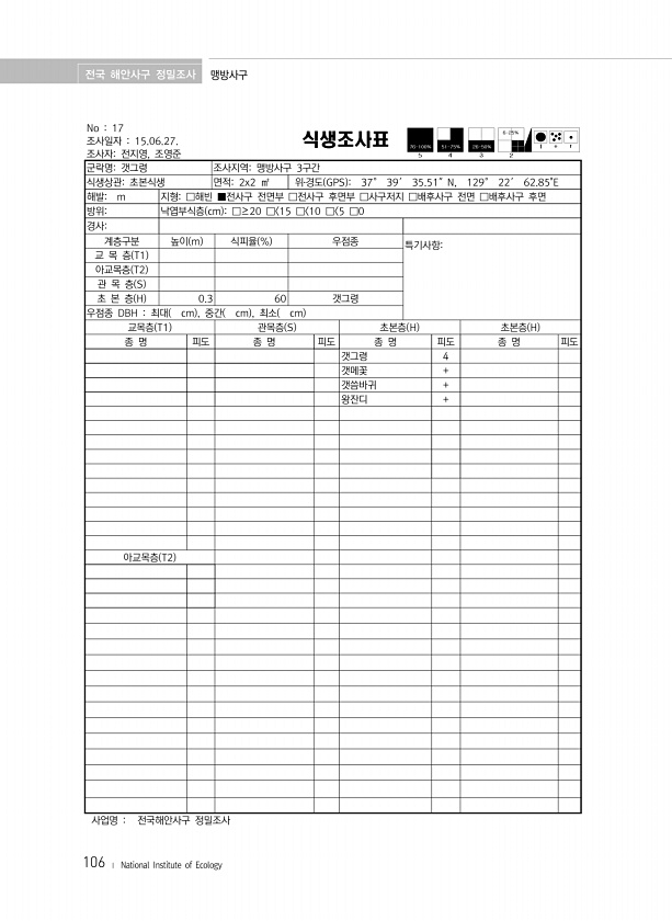 전국 해안사구 정밀조사 맹방사구 106 ? National Institute of Ecology No 17 조사일자 15.06.27. 조사자전지영, 조영준 식생조사표 군락명갯그령 조사지역맹방사구 3구간 식생상관초본식생 면적2x2 ㎡ 위?경도 GPS 37° 39′ 35.51″N, 129° 22′ 62.85E 해발m 지형□해빈 ■전사구 전면부 □전사구 후면부 □사구저지 □배후사구 전면 □배후사구 후면 방위낙엽부식층 cm □≥20 □ 15 □ 10 □ 5 □0 경사계층구분 높이 m 식피율 % 우점종 특기사항교 목 층 T1 아교목층 T2 관 목 층 S 초 본 층 H 0.3 60 갯그령 우점종 DBH 최대 cm , 중간 cm , 최소 cm 교목층 T1 관목층 S 초본층 H 초본층 H 종 명 피도 종 명 피도 종 명 ...