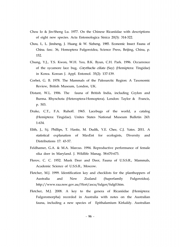96 Chou Io & Jin-Sheng Lu. 1977. On the Chinese Ricaniidae with descriptions of eight new species. Acta Entomologica Sinica 20 3 314-322. Chou, I., L. Jinsheng, J. Huang & W. Sizheng. 1985. Economic Insect Fauna of China. fasc. 36, Homoptera Fulgoroidea, Science Press, Beijing, China, p. 152. Chung, Y.J., T.S. Kwon, W.H. Yeo, B.K. Byun, C.H. Park. 1996. Occurrence of the sycamore lace bug, Corythu...