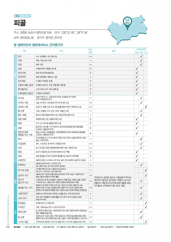 No. 속초- 본 생태자산의 생태계서비스 간이평가지 구분 예시 평가 등급 설명 규모별 혜택 지점 지역 국가 공급 담수 식수, 농업용수, 축산 용수 등 ++ √ 식량 곡물, 과실, 물고기 등 + √ 연료 화목, 토탄 ++ √ 섬유 건축용 목재, 의류용 섬유 등 0 √ 유전자원 농업·축산업 희귀품종 등 0 √ 천연약재 전통 의약품에 사용되는 식물 + √ 장식재료 수집용 조개껍질, 꽃 등 0 √ 진흙,미네랄, 골재 건축용 모래 또는 자갈, 벽돌재료 진흙 등 0 √ 폐기물처리 고체 쓰레기 하치, 폐수 방류 등 0 √ 친환경에너지발전 조력발전, 풍력발전 0 √ 조절 대기질 자동차 배기가스, 산업체 대기오염, 농업발생 먼지 등의 대기 미세물질의 제거 + √ 지역적 기후 그늘, 대기온도 저하 등의 지역 미세기후 조절 +...