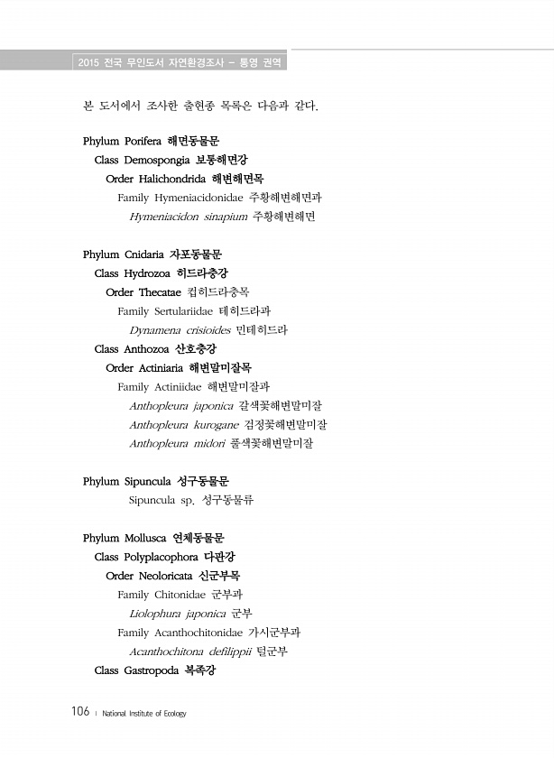 2015 전국 무인도서 자연환경조사 통영 권역 106 ? National Institute of Ecology 본 도서에서 조사한 출현종 목록은 다음과 같다. Phylum Porifera 해면동물문 Class Demospongia 보통해면강 Order Halichondrida 해변해면목 Family Hymeniacidonidae 주황해변해면과 Hymeniacidon sinapium 주황해변해면 Phylum Cnidaria 자포동물문 Class Hydrozoa 히드라충강 Order Thecatae 컵히드라충목 Family Sertulariidae 테히드라과 Dynamena crisioides 민테히드라 Class Anthozoa 산호충강 Order Actiniaria 해변말미잘목 Family Actiniida...