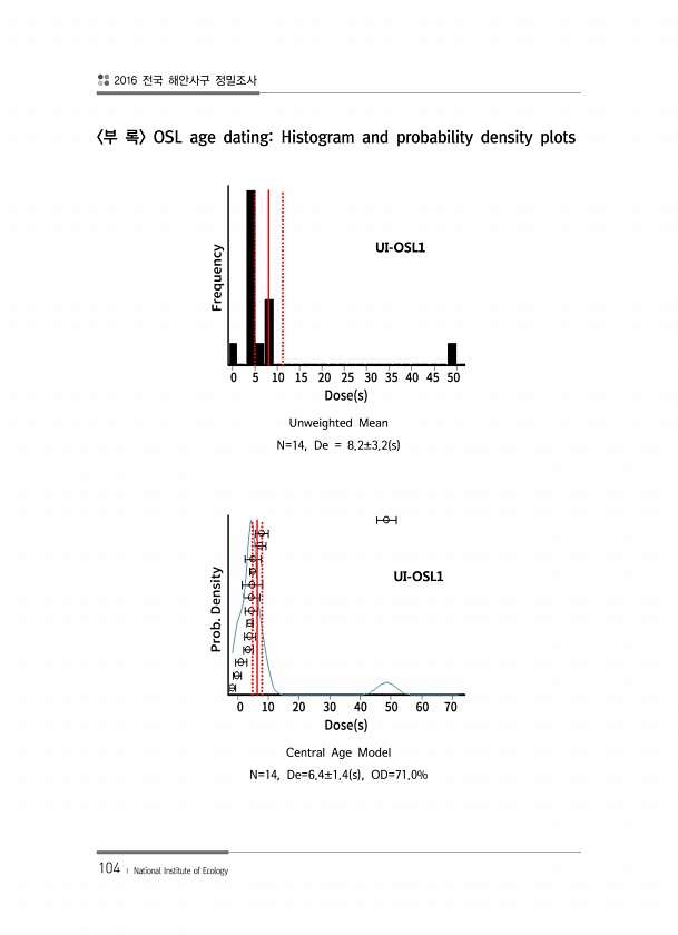 2016 전국 해안사구 정밀조사 104 ? National Institute of Ecology 부 록 OSL age datingHistogram and probability density plots UI-OSL1 Unweighted Mean N=14, De = 8.2±3.2 s UI-OSL1 Central Age Model N=14, De=6.4±1.4 s ,OD=71.0%