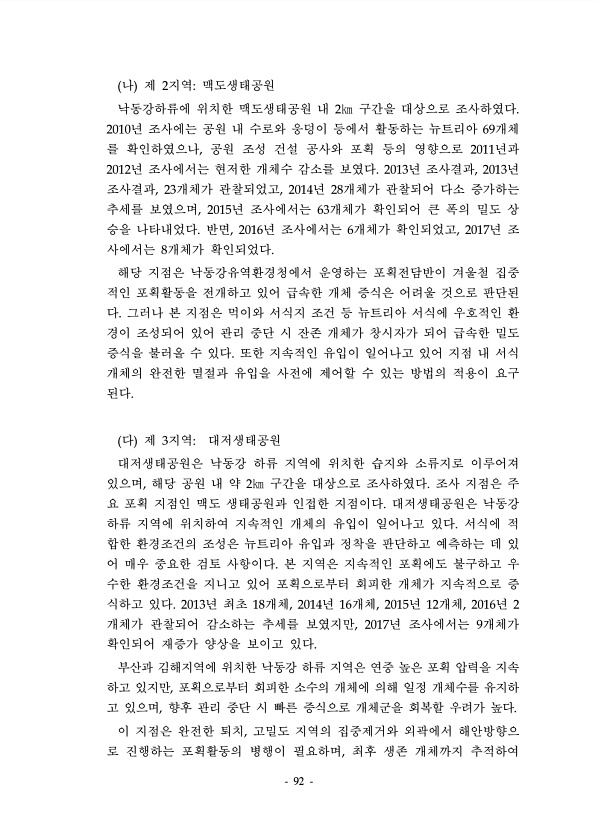 92 나 제 2지역맥도생태공원 낙동강하류에 위치한 맥도생태공원 내 2㎞ 구간을 대상으로 조사하였다. 2010년 조사에는 공원 내 수로와 웅덩이 등에서 활동하는 뉴트리아 69개체 를 확인하였으나, 공원 조성 건설 공사와 포획 등의 영향으로 2011년과 2012년 조사에서는 현저한 개체수 감소를 보였다. 2013년 조사결과, 2013년 조사결과, 23개체가 관찰되었고, 2014년 28개체가 관찰되어 다소 증가하는 추세를 보였으며, 2015년 조사에서는 63개체가 확인되어 큰 폭의 밀도 상 승을 나타내었다. 반면, 2016년 조사에서는 6개체가 확인되었고, 2017년 조 사에서는 8개체가 확인되었다. 해당 지점은 낙동강유역환경청에서 운영하는 포획전담반이 겨울철 집중 적인 포획활동을 전개하고 있어 급속한 개체 증식...