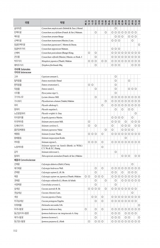 112 솜아마존 Cynanchum amplexicaule Siebold & Zucc. Hemsl. ○ 민백미꽃 Cynanchum ascyrifolium Franch. & Sav. Matsum. ○ ○ ○ ○ ○ ○ ○ ○ ○ ○ 백미꽃 Cynanchum atratum Bunge ○ ○ ○ ○ ○ ○ 선백미꽃 Cynanchum inamoenum Maxim. Loes. ○ ○ ○ ○ 덩굴민백미꽃 Cynanchum japonicum C. Morren & Decne. ○ 덩굴박주가리 Cynanchum nipponicum Matsum. ○ ○ ○ 산해박 Cynanchum paniculatum Bunge Kitag. ○ ○ ○ ○ ○ ○ ○ ○ ○ ○ ○ 큰조롱 Cynanchum wilfordii Maxim. Maxi...