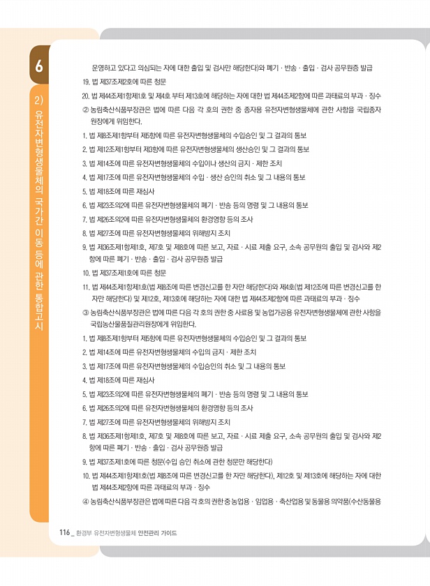 116 _ 환경부 유전자변형생물체 안전관리 가이드 6 유전자변형생물체의 국가간 이동 등에 관한 통합고시 2 운영하고 있다고 의심되는 자에 대한 출입 및 검사만 해당한다 와 폐기·반송·출입·검사 공무원증 발급 19. 법 제37조제2호에 따른 청문 20. 법 제44조제1항제1호 및 제4호 부터 제13호에 해당하는 자에 대한 법 제44조제2항에 따른 과태료의 부과·징수 ② 농림축산식품부장관은 법에 따른 다음 각 호의 권한 중 종자용 유전자변형생물체에 관한 사항을 국립종자 원장에게 위임한다. 1. 법 제8조제1항부터 제5항에 따른 유전자변형생물체의 수입승인 및 그 결과의 통보 2. 법 제12조제1항부터 제3항에 따른 유전자변형생물체의 생산승인 및 그 결과의 통보 3. 법 제14조에 따른 유전자변형생물체의 수입이나 ...