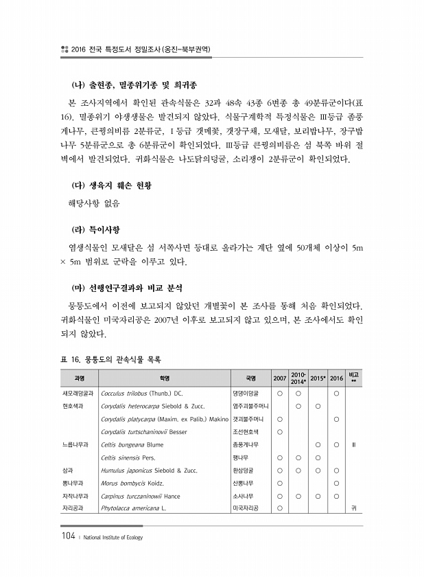2016 전국 특정도서 정밀조사 옹진-북부권역 104 ? National Institute of Ecology 과명 학명 국명 2007 2010? 2014* 2015* 2016 비고 ** 새모래덩굴과 Cocculus trilobus Thunb. DC. 댕댕이덩굴 ○ ○ ○ 현호색과 Corydalis heterocarpa Siebold & Zucc. 염주괴불주머니 ○ ○ Corydalis platycarpa Maxim. ex Palib. Makino 갯괴불주머니 ○ ○ Corydalis turtschaninovii Besser 조선현호색 ○ 느릅나무과 Celtis bungeana Blume 좀풍게나무 ○ ○ Ⅲ Celtis sinensis Pers. 팽나무 ○ ○ ○ 삼과 Humulus japonicus Si...