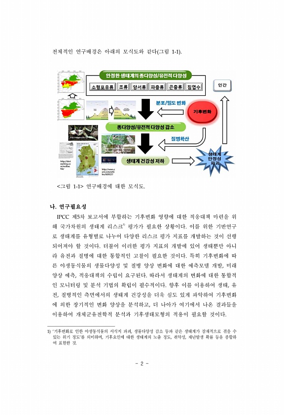 2 전체적인 연구배경은 아래의 모식도와 같다 그림 1-1 그림 1-1 연구배경에 대한 모식도. 나. 연구필요성 IPCC 제5차 보고서에 부합하는 기후변화 영향에 대한 적응대책 마련을 위 해 국가차원의 생태계 리스크1 평가가 필요한 상황이다. 이를 위한 기반연구 로 생태계를 유형별로 나누어 다양한 리스크 평가 지표를 개발하는 것이 선행 되어져야 할 것이다. 더불어 이러한 평가 지표의 개발에 있어 생태뿐만 아니 라 유전과 질병에 대한 통합적인 고찰이 필요한 것이다. 특히 기후변화에 따 른 야생동식물의 생물다양성 및 질병 양상 변화에 대한 예측모델 개발, 미래 양상 예측, 적응대책의 수립이 요구된다. 따라서 생태계의 변화에 대한 통합적 인 모니터링 및 분석 기법의 확립이 필수적이다. 향후 이를 이용하여 생태, 유...