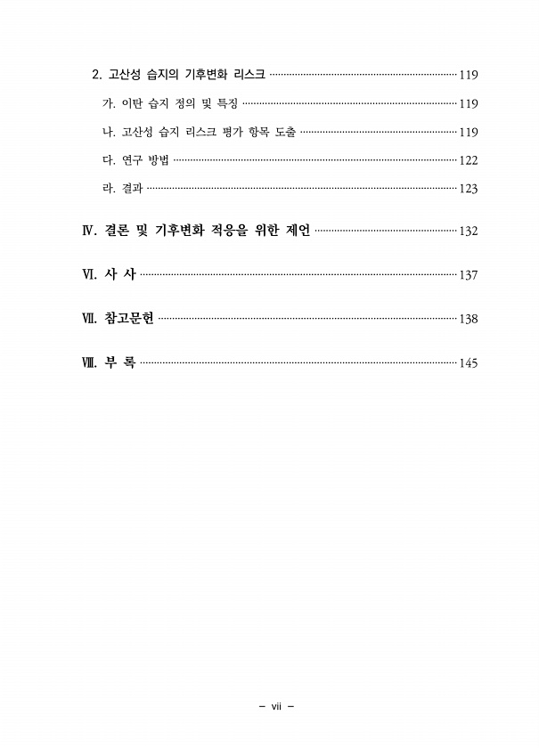 vii 2. 고산성 습지의 기후변화 리스크 ···································································119 가. 이탄 습지 정의 및 특징 ············································································119 나. 고산성 습지 리스크 평가 항목 도출 ························································119 다. 연구 방법 ·····································································································122 라. 결과 ·····...