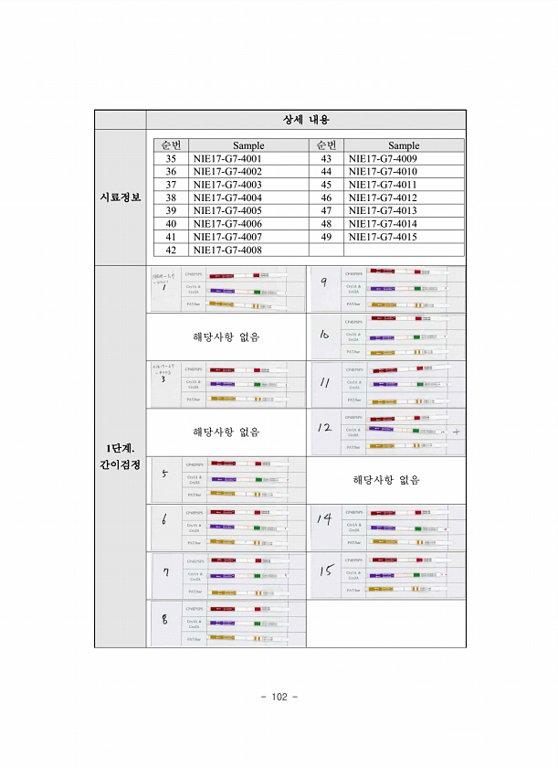 102 상세 내용 시료정보 순번 Sample 순번 Sample 35 NIE17-G7-4001 43 NIE17-G7-4009 36 NIE17-G7-4002 44 NIE17-G7-4010 37 NIE17-G7-4003 45 NIE17-G7-4011 38 NIE17-G7-4004 46 NIE17-G7-4012 39 NIE17-G7-4005 47 NIE17-G7-4013 40 NIE17-G7-4006 48 NIE17-G7-4014 41 NIE17-G7-4007 49 NIE17-G7-4015 42 NIE17-G7-4008 1단계. 간이검정 해당사항 없음 해당사항 없음 해당사항없음