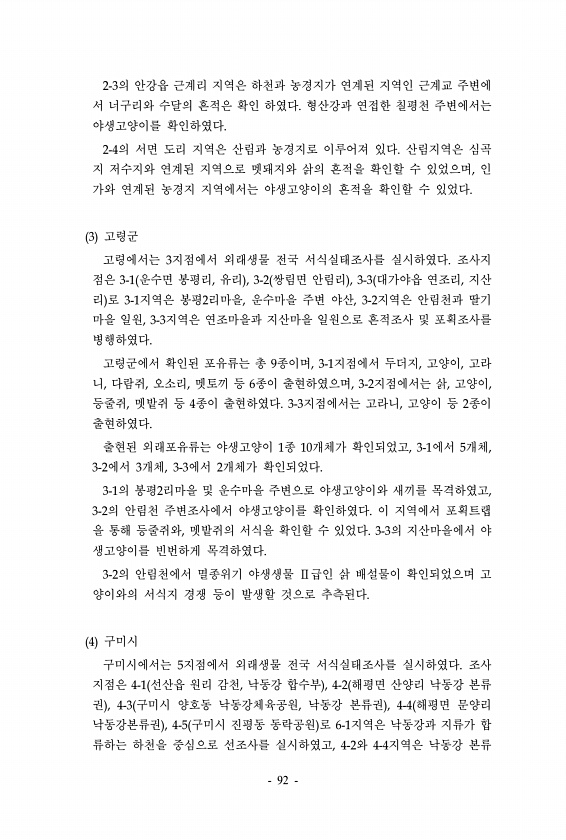 2-3의 안강읍 근계리 지역은 하천과 농경지가 연계된 지역인 근계교 주변에 서 너구리와 수달의 흔적은 확인 하였다. 형산강과 연접한 칠평천 주변에서는 야생고양이를 확인하였다. 2-4의 서면 도리 지역은 산림과 농경지로 이루어져 있다. 산림지역은 심곡 지 저수지와 연계된 지역으로 멧돼지와 삵의 흔적을 확인할 수 있었으며, 인 가와 연계된 농경지 지역에서는 야생고양이의 흔적을 확인할 수 있었다. 3 고령군 고령에서는 3지점에서 외래생물 전국 서식실태조사를 실시하였다. 조사지 점은 3-1 운수면 봉평리, 유리 , 3-2 쌍림면 안림리 , 3-3 대가야읍 연조리, 지산 리 로 3-1지역은 봉평2리마을, 운수마을 주변 야산, 3-2지역은 안림천과 딸기 마을 일원, 3-3지역은 연조마을과 지산마을 일원으로 흔적조사 및...