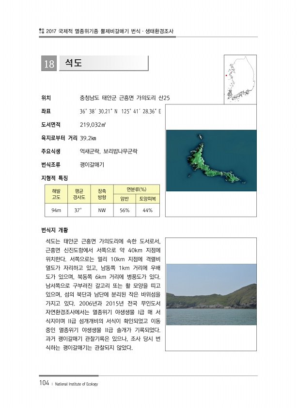 2017 국제적 멸종위기종 뿔제비갈매기 번식·생태환경조사 104 ? National Institute of Ecology 18 석도 위치 충청남도 태안군 근흥면 가의도리 산25 좌표 36°38′30.21″N 125°41′28.36″E 도서면적 219,032㎡ 육지로부터 거리 39.2㎞ 주요식생 억새군락, 보리밥나무군락 번식조류 괭이갈매기 지형적 특징 해발 고도 평균 경사도 장축 방향 면분류 % 암반 토양피복 94m 37° NW 56% 44% 번식지 개황 석도는 태안군 근흥면 가의도리에 속한 도서로서, 근흥면 신진도항에서 서쪽으로 약 40km 지점에 위치한다. 서쪽으로는 멀리 10km 지점에 격렬비 열도가 자리하고 있고, 남동쪽 1km 거리에 우배 도가 있으며, 북동쪽 6km 거리에 병풍도가 있다. 남서쪽으로...