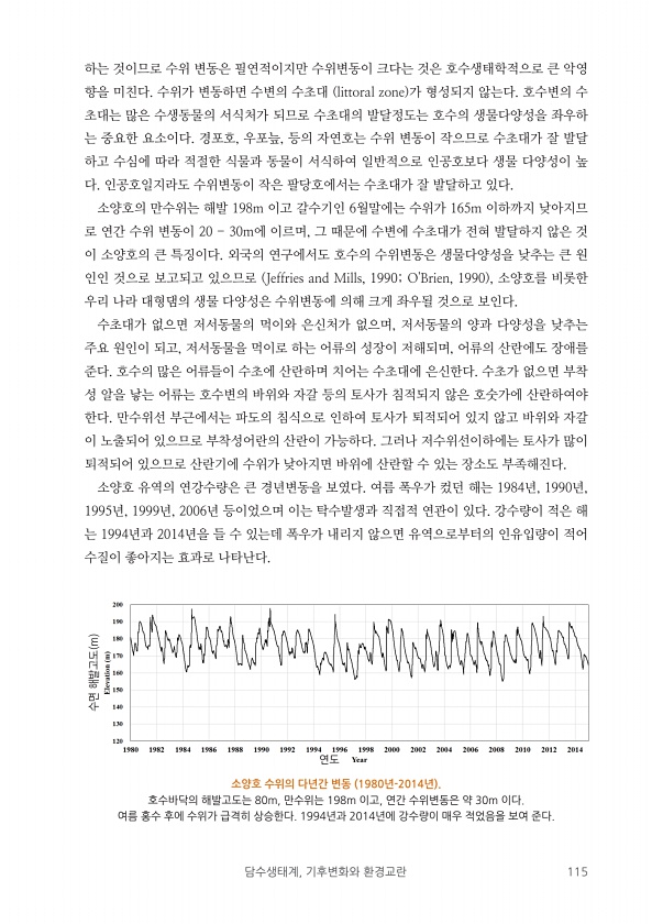 담수생태계, 기후변화와 환경교란 115 소양호 수위의 다년간 변동 1980년-2014년 호수바닥의 해발고도는 80m, 만수위는 198m 이고, 연간 수위변동은 약 30m 이다. 여름 홍수 후에 수위가 급격히 상승한다. 1994년과 2014년에 강수량이 매우 적었음을 보여 준다. 하는 것이므로 수위 변동은 필연적이지만 수위변동이 크다는 것은 호수생태학적으로 큰 악영 향을 미친다. 수위가 변동하면 수변의 수초대 littoral zone 가 형성되지 않는다. 호수변의 수 초대는 많은 수생동물의 서식처가 되므로 수초대의 발달정도는 호수의 생물다양성을 좌우하 는 중요한 요소이다. 경포호, 우포늪, 등의 자연호는 수위 변동이 작으므로 수초대가 잘 발달 하고 수심에 따라 적절한 식물과 동물이 서식하여 일반적으로 인공호보...