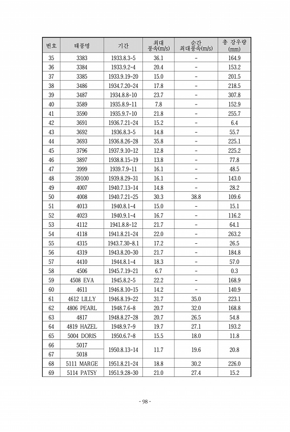 번호 태풍명 기간 풍속최대 m/s 최대풍속 순간 m/s 총 mm 강우량 35 3383 1933.8.3-5 36.1 164.9 36 3384 1933.9.2-4 20.4 153.2 37 3385 1933.9.19-20 15.0 201.5 38 3486 1934.7.20-24 17.8 218.5 39 3487 1934.8.8-10 23.7 307.8 40 3589 1935.8.9-11 7.8 152.9 41 3590 1935.9.7-10 21.8 255.7 42 3691 1936.7.21-24 15.2 6.4 43 3692 1936.8.3-5 14.8 55.7 44 3693 1936.8.26-28 35.8 225.1 45 3796 1937.9.10-12 12.8 225.2 46 3897 1938.8.15-19 ...