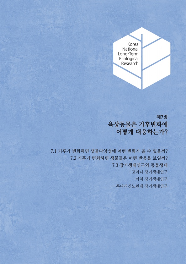기후변화와 연안생물, 육상동물의 생존전략 115 Korea National Long-Term Ecological Research 제7장 육상동물은 기후변화에 어떻게 대응하는가? 7.1 기후가 변화하면 생물다양성에 어떤 변화가 올 수 있을까? 7.2 기후가 변화하면 생물들은 어떤 반응을 보일까? 7.3 장기생태연구와 동물생태 -고라니 장기생태연구 -까치 장기생태연구 -흑다리긴노린재장기생태연구