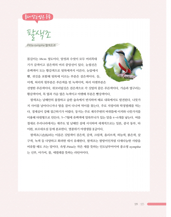 114 115 좀더알고싶은동물 팔색조 몸길이는 18cm 정도이다. 암컷과 수컷이 모두 머리꼭대 기가 갈색이고 검은색의 머리 중앙선이 있다. 눈썹선은 유백색이 도는 황갈색으로 뒷목에까지 이른다. 눈앞에서 뺨, 귀깃을 포함해 뒷목에 이르는 부분은 검은색이다. 등, 어깨, 허리의 윗부분은 푸른색을 띤 녹색이며, 허리 아랫부분은 선명한 푸른색이다. 위꼬리덮깃은 검은색으로 각 깃털의 끝은 푸른색이다. 가슴과 옆구리는 황갈색이며, 목 옆과 가슴 옆은 녹색이고 아랫배 부분은 빨강색이다. 팔색조는 남해안의 울창하고 습한 숲속에서 번식하며 때로 내륙에서도 발견된다. 나뭇가 지 사이를 날아다니거나 땅을 걸어 다니며 먹이를 찾는다. 주로 지렁이와 딱정벌레를 먹는 다. 경계심이 강해 접근하기가 어렵다. 둥지는 주로 계곡주변의 바...