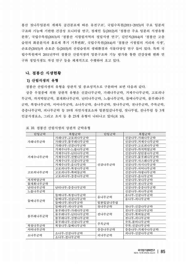 봉산 잣나무임분의 개체목 공간분포에 따른 유전구조 국립수목원 의 주요 임분의 구조와 기능에 기반한 건강성 모니터링 연구 정재민 등 의 점봉산 주요 임분의 식생유형 분류 국립수목원 의 점봉산 시험림지역의 정밀식생 연구 김민지 의 점봉산 고층 습원의 화분분석과 홀로세 후기 기후변화 국립수목원 의 점봉산 시험림의 지리와 식생 손호준 과 손호준 등 의 산림습원의 생태환경과 식물다양성 연구 들이 있다 특히 국 립수목원에서 년부터 점봉산 산림식생의 임분구조와 기능 평가를 통한 건강상태 변화 연 구와 정밀식생도 작성 연구 등을 체계적으로 수행하여 오고 있다 나 점봉산 식생현황 산림식생의 유형 점봉산 산림식생의 유형을 상관적 및 종조성적으로 구분하여 보면 다음과 같다 상층 우점종에 의한 상관적 유형은 신갈나무군락 가래나무...