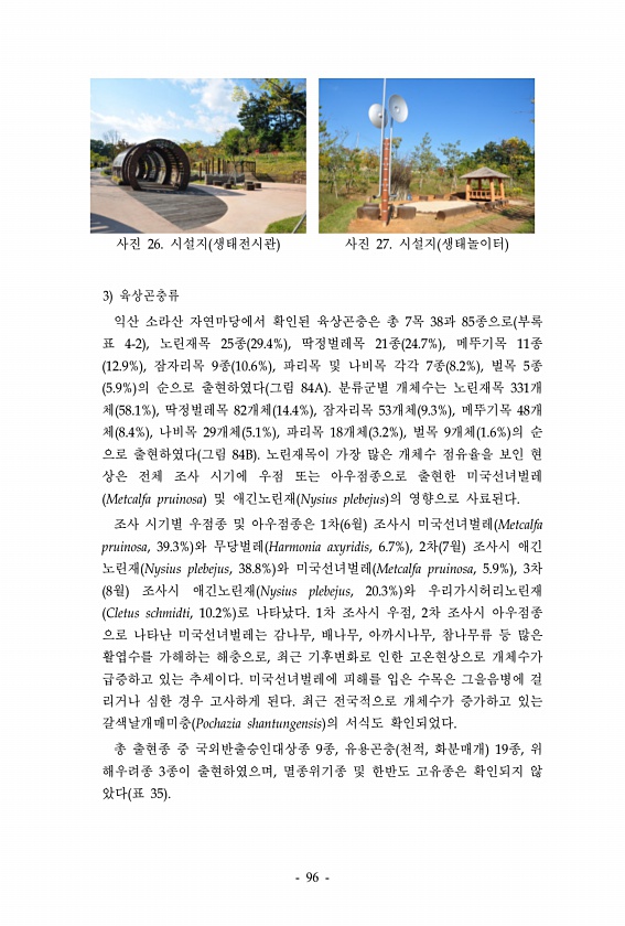 사진 26. 시설지 생태전시관 사진 27. 시설지 생태놀이터 3 육상곤충류 익산 소라산 자연마당에서 확인된 육상곤충은 총 7목 38과 85종으로 부록 표 4-2 , 노린재목 25종 29.4% , 딱정벌레목 21종 24.7% , 메뚜기목 11종 12.9% , 잠자리목 9종 10.6% , 파리목 및 나비목 각각 7종 8.2% , 벌목 5종 5.9% 의 순으로 출현하였다 그림 84A 분류군별 개체수는 노린재목 331개 체 58.1% , 딱정벌레목 82개체 14.4% , 잠자리목 53개체 9.3% , 메뚜기목 48개 체 8.4% , 나비목 29개체 5.1% , 파리목 18개체 3.2% , 벌목 9개체 1.6% 의 순 으로 출현하였다 그림 84B 노린재목이 가장 많은 개체수 점유율을 보인 현 상은 전체 조사 시기에 ...