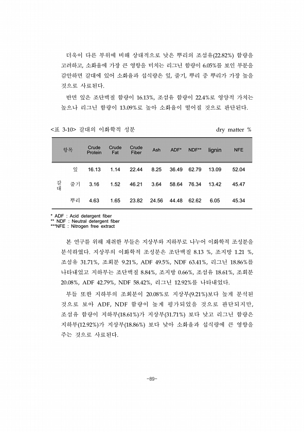 -89- 더욱이 다른 부위에 비해 상대적으로 낮은 뿌리의 조섬유 22.82% 함량을 고려하고, 소화율에 가장 큰 영항을 미치는 리그닌 함량이 6.05%를 보인 부분을 감안하면 갈대에 있어 소화율과 섭식량은 잎, 줄기, 뿌리 중 뿌리가 가장 높을 것으로 사료된다. 반면 잎은 조단백질 함량이 16.13%, 조섬유 함량이 22.4%로 영양적 가치는 높으나 리그닌 함량이 13.09%로 높아 소화율이 떨어질 것으로 판단된다. 표 3-10 갈대의 이화학적 성분 dry matter % 항목 Protein Crude Crude Fat Crude Fiber Ash ADF* NDF** lignin NFE 갈대 잎 16.13 1.14 22.44 8.25 36.49 62.79 13.09 52.04 줄기 3.16 1.52 46.2...