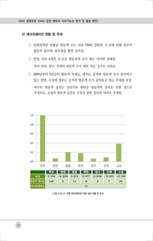 96 DMZ 생태포럼 DMZ 일원 생태적 지속가능성 평가 및 활용 방안 6 레크리에이션 현황 및 추세 ○ 단위면적당 연평균 방문객 수는 다른 DMZ 일원의 시·군에 비해 파주가 월등히 많으며, 참조점을 훨씬 넘어섬. ○ 반면, 다른 6개의 시·군은 방문자의 수가 매우 미미한 상태임. 특히 연천, 양구, 인제의 방문객 수가 매우 적은 것으로 나타남. ○ 2009년부터 5년간의 방문객 추세는, 파주는 급격히 방문객 수가 증가하고 있는 반면, 고성의 경우는 급격히 방문객 수가 줄어들고 있는 추세를 보임. 파주의 방문객 증가는 임진각과 한탄강 방문객의 증가로 인한 것으로 추정되고, 고성의 방문객 급감은 금강산 관광 중단의 여파로 추정됨. [그림 4-8] 시·군별 레크리에이션 목표 달성 비율 및추세