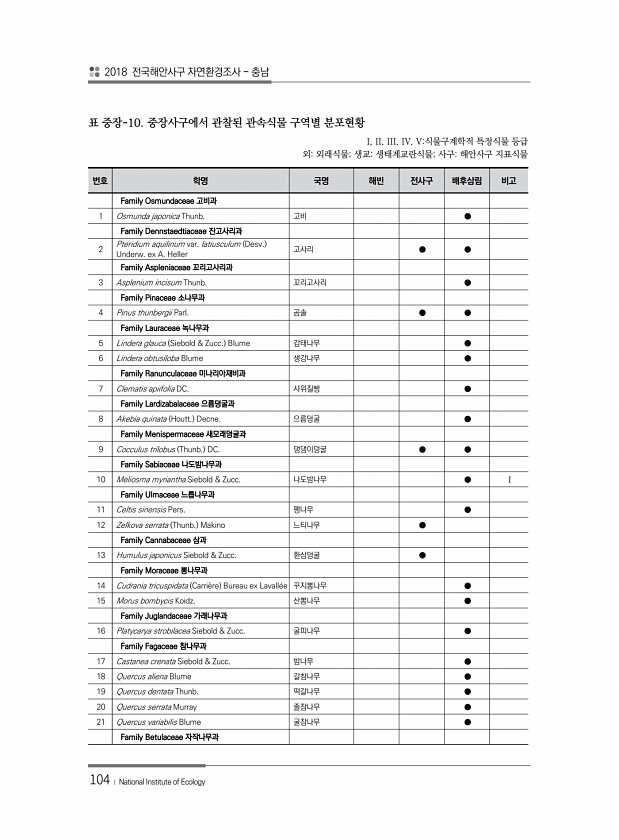 2018 전국해안사구 자연환경조사 충남 104 ? National Institute of Ecology 번호 학명 국명 해빈 전사구 배후삼림 비고 Family Osmundaceae 고비과 1 Osmunda japonica Thunb. 고비 ● Family Dennstaedtiaceae 잔고사리과 2 Pteridium aquilinum var. latiusculum Desv. Underw. ex A. Heller 고사리 ● ● Family Aspleniaceae 꼬리고사리과 3 Asplenium incisum Thunb. 꼬리고사리 ● Family Pinaceae 소나무과 4 Pinus thunbergii Parl. 곰솔 ● ● Family Lauraceae 녹나무과 5 Lindera glauca Siebol...