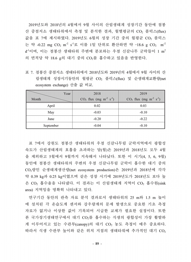 89 2019 2018 4 9 , CO2 flux 7 2019 6 CO2 -0.22 mg CO2 m-2 s-1 1 18.6 g CO2 m-2 d-1 , 1 m2 18.6 g CO2 7. 2018 2019 4 9 CO2 flux net ecosystem exchange Year Month 2018 CO2 flux mg m-2 s-1 2019 CO2 flux mg m-2 s-1 April 0.02 0.03 May -0.03 -0.10 June -0.20 -0.22 September -0.04 -0.10 7 2019 2018 4 5 9 4, 5, 6, 9 CO2 net ecosystem production 2019 2018 0.39 kg 0.25 kg 2019 2018 CO2 CO2 sink area 25 m 1...