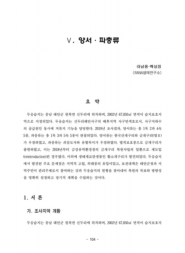 104 Ⅴ. 양서·파충류 라남용·백상정 RANA생태연구소 요 약 두웅습지는 충남 태안군 원북면 신두리에 위치하며, 2002년 67,050㎡ 면적이 습지보호지 역으로 지정되었다. 두웅습지는 신두리해안사구의 배후지역 사구언색호로서, 사구지하수 의 공급원인 동시에 저류지 기능을 담당한다. 2019년 조사결과, 양서류는 총 1목 2과 4속 5종, 파충류는 총 1목 3과 5속 5종이 관찰되었다. 양서류는 한국산개구리와 금개구리 멸Ⅱ 가 우점하였고, 파충류는 쇠살모사와 유혈목이가 우점하였다. 법적보호종으로 금개구리가 출현하였고, 이는 2018년부터 금강유역환경청의 금개구리 복원사업의 일환으로 재도입 reintroduction 된 경우였다. 이외에 생태계교란생물인 황소개구리가 발견되었다. 두웅습지 에서 발견된 주요 문제...