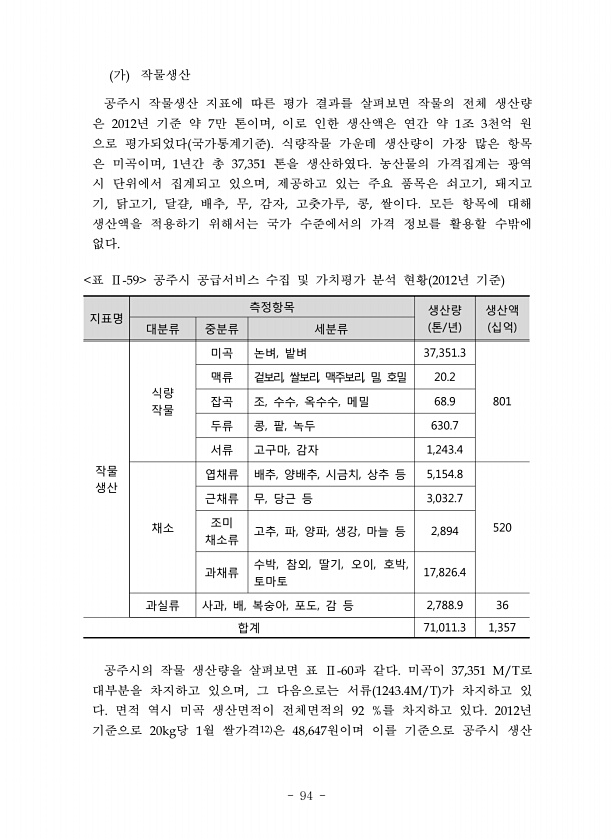 94 가 작물생산 공주시 작물생산 지표에 따른 평가 결과를 살펴보면 작물의 전체 생산량 은 년 기준 약 만 톤이며 이로 인한 생산액은 연간 약 조 천억 원 으로 평가되었다 국가통계기준 식량작물 가운데 생산량이 가장 많은 항목 은 미곡이며 년간 총 톤을 생산하였다 농산물의 가격집계는 광역 시 단위에서 집계되고 있으며 제공하고 있는 주요 품목은 쇠고기 돼지고 기 닭고기 달걀 배추 무 감자 고춧가루 콩 쌀이다 모든 항목에 대해 생산액을 적용하기 위해서는 국가 수준에서의 가격 정보를 활용할 수밖에 없다 지표명 측정항목 생산량 톤/년 생산액 대분류 중분류 세분류 십억 작물 생산 식량 작물 미곡 논벼, 밭벼 37,351.3 801 맥류 겉보리, 쌀보리, 맥주보리, 밀, 호밀 20.2 잡곡 조, 수수, 옥수수, 메밀 6...