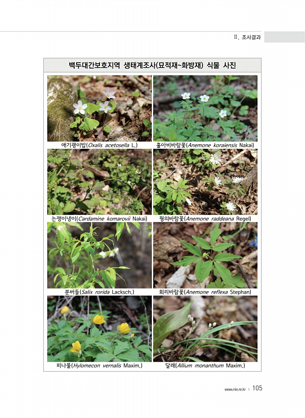 Ⅱ. 조사결과 www.nie.re.kr ? 105 백두대간보호지역 생태계조사 묘적재화방재 식물 사진 애기괭이밥 Oxalis acetosella L. 홀아비바람꽃 Anemone koraiensis Nakai 는쟁이냉이 Cardamine komarovii Nakai 꿩의바람꽃 Anemone raddeana Regel 분버들 Salix rorida Lacksch. 회리바람꽃 Anemone reflexa Stephan 피나물 Hylomecon vernalis Maxim. 달래 Allium monanthum Maxim.