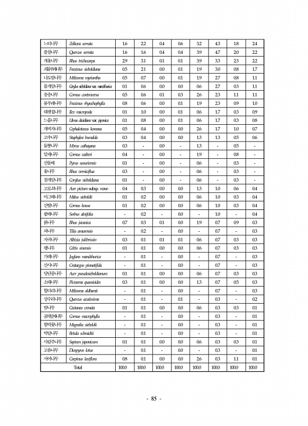 85 느티나무 Zelkova serrata 1.6 2.2 0.4 0.6 3.2 4.3 1.8 2.4 졸참나무 Quercus serrata 1.6 1.6 0.4 0.4 3.9 4.7 2.0 2.2 개옻나무 Rhus trichocarpa 2.9 3.1 0.1 0.1 3.9 3.3 2.3 2.2 쇠물푸레나무 Fraxinus sieboldiana 0.5 2.1 0.0 0.1 1.9 3.0 0.8 1.7 나도밤나무 Meliosma myriantha 0.5 0.7 0.0 0.1 1.9 2.7 0.8 1.1 물개암나무 Corylus sieboldianavar. mandshurica 0.1 0.6 0.0 0.0 0.6 2.7 0.3 1.1 층층나무 Cornus controversa 0.5 0.6 0.1 0.3 2.6 2....