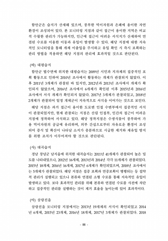 88 함안군은 습지가 산재해 있으며, 풍부한 먹이자원과 은폐에 용이한 자연 환경이 조성되어 있다. 본 모니터링 지점과 같이 접근이 용이한 지역은 비교 적 수월한 관리가 가능하지만, 인근에 접근이 어려운 서식지가 산재하여 연 결된 수로를 이용한 이동과 유입이 발생할 수 있다. 해당 지점에 대한 지속 적인 모니터링을 통해 개체 이출입을 주시하고 유입 확인 시 즉시 포획하는 관리 방법을 적용하면 해당 지점의 관리에 효과적일 것으로 판단된다. 바 대평습지 함안군 법수면에 위치한 대평습지는 2009년 시민과 지자체의 집중적인 포 획 활동으로 인하여 2010년 조사에서 활동하는 개체가 관찰되지 않았다. 이 후 2011년 3개체가 관찰된 바 있지만, 2012년과 2013년 조사에서 개체가 확 인되지 않았으며, 2016년...
