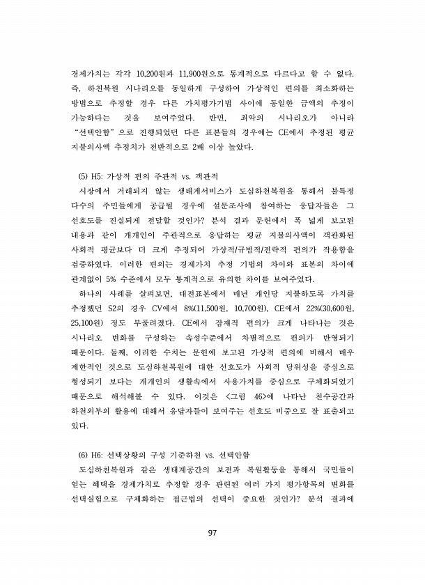 97 경제가치는 각각 10,200원과 11,900원으로 통계적으로 다르다고 할 수 없다. 즉, 하천복원 시나리오를 동일하게 구성하여 가상적인 편의를 최소화하는 방법으로 추정할 경우 다른 가치평가기법 사이에 동일한 금액의 추정이 가능하다는 것을 보여주었다. 반면, 최악의 시나리오가 아니라 “선택안함” 으로 진행되었던 다른 표본들의 경우에는 CE에서 추정된 평균 지불의사액 추정치가 전반적으로 2배 이상 높았다. 5 H5가상적 편의 주관적 vs. 객관적 시장에서 거래되지 않는 생태계서비스가 도심하천복원을 통해서 불특정 다수의 주민들에게 공급될 경우에 설문조사에 참여하는 응답자들은 그 선호도를 진실되게 전달할 것인가? 분석 결과 문헌에서 폭 넓게 보고된 내용과 같이 개개인이 주관적으로 응답하는 평균 지불의사액이 객...