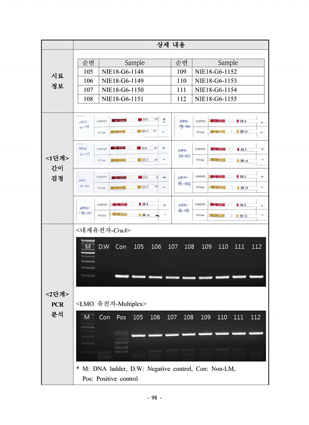 98 상세 내용 시료 정보 순번 Sample 순번 Sample 105 NIE18-G6-1148 109 NIE18-G6-1152 106 NIE18-G6-1149 110 NIE18-G6-1153 107 NIE18-G6-1150 111 NIE18-G6-1154 108 NIE18-G6-1151 112 NIE18-G6-1155 1단계 간이 검정 2단계 PCR 분석 내재유전자-CruA LMO 유전자-Multiplex * MDNA ladder, D.WNegative control, ConNon-LM, PosPositivecontrol