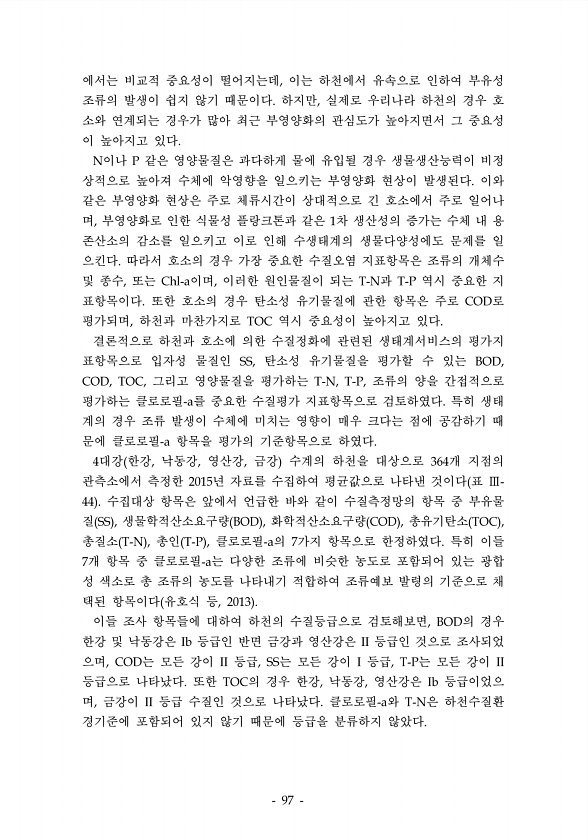 에서는 비교적 중요성이 떨어지는데 이는 하천에서 유속으로 인하여 부유성 조류의 발생이 쉽지 않기 때문이다 하지만 실제로 우리나라 하천의 경우 호 소와 연계되는 경우가 많아 최근 부영양화의 관심도가 높아지면서 그 중요성 이 높아지고 있다 이나 같은 영양물질은 과다하게 물에 유입될 경우 생물생산능력이 비정 상적으로 높아져 수체에 악영향을 일으키는 부영양화 현상이 발생된다 이와 같은 부영양화 현상은 주로 체류시간이 상대적으로 긴 호소에서 주로 일어나 며 부영양화로 인한 식물성 플랑크톤과 같은 차 생산성의 증가는 수체 내 용 존산소의 감소를 일으키고 이로 인해 수생태계의 생물다양성에도 문제를 일 으킨다 따라서 호소의 경우 가장 중요한 수질오염 지표항목은 조류의 개체수 및 종수 또는 이며 이러한 원인물질이 되는 과 ...