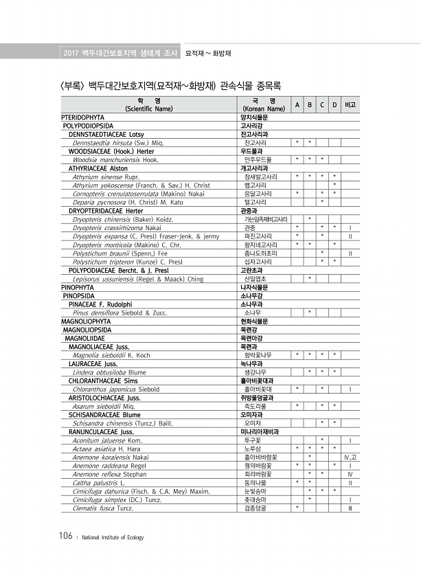 2017 백두대간보호지역 생태계 조사 묘적재 화방재 106 ? National Institute of Ecology 부록 백두대간보호지역 묘적재화방재 관속식물 종목록 학 명 Scientific Name 국 명 Korean Name A B C D 비고 PTERIDOPHYTA 양치식물문 POLYPODIOPSIDA 고사리강 DENNSTAEDTIACEAE Lotsy 잔고사리과 Dennstaedtia hirsuta Sw. Miq. 잔고사리 * * WOODSIACEAE Hook. Herter 우드풀과 Woodsia manchuriensis Hook. 만주우드풀 * * * ATHYRIACEAE Alston 개고사리과 Athyrium sinense Rupr. 참새발고사리 * * * * Athyrium yokoscense ...