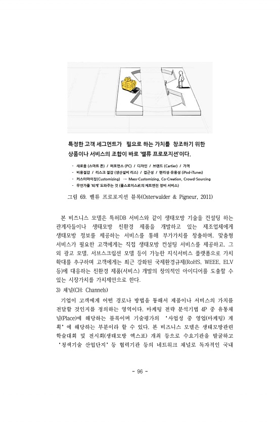 96 그림 69. 밸류 프로포지션 블록 Osterwalder & Pigneur, 2011 본 비즈니스 모델은 특허DB 서비스와 같이 생태모방 기술을 컨설팅 하는 관계자들이나 생태모방 친환경 제품을 개발하고 있는 제조업체에게 생태모방 정보를 제공하는 서비스를 통해 부가가치를 창출하며, 맞춤형 서비스가 필요한 고객에게는 직접 생태모방 컨설팅 서비스를 제공하고, 그 외 광고 모델, 서브스크립션 모델 등이 가능한 지식서비스 플랫폼으로 가치 확대를 추구하며 고객에게는 최근 강화된 국제환경규제 RoHS, WEEE, ELV 등 에 대응하는 친환경 제품 서비스 개발의 창의적인 아이디어를 도출할 수 있는 시장가치를 가치제안으로 한다. 3 채널 CHChannels 기업이 고객에게 어떤 경로나 방법을 통해서 제품이나 서비스의 ...