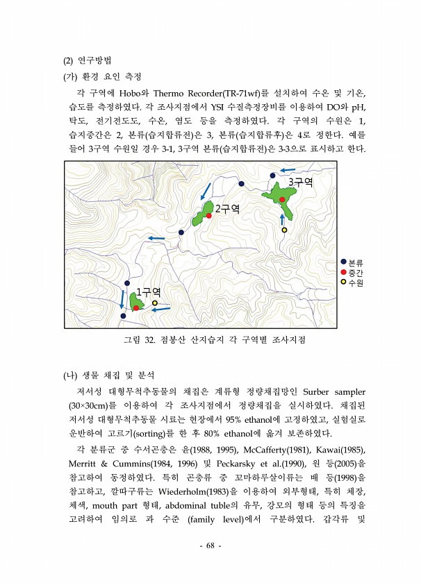 68 2 연구방법 가 환경 요인 측정 각 구역에 Hobo와 Thermo Recorder TR-71wf 를 설치하여 수온 및 기온, 습도를 측정하였다. 각 조사지점에서 YSI 수질측정장비를 이용하여 DO와 pH, 탁도, 전기전도도, 수온, 염도 등을 측정하였다. 각 구역의 수원은 1, 습지중간은 2, 본류 습지합류전 은 3, 본류 습지합류후 은 4로 정한다. 예를 들어 3구역 수원일 경우 3-1, 3구역 본류 습지합류전 은 3-3으로 표시하고 한다. 그림 32. 점봉산 산지습지 각 구역별 조사지점 나 생물 채집 및 분석 저서성 대형무척추동물의 채집은 계류형 정량채집망인 Surber sampler 30×30cm 를 이용하여 각 조사지점에서 정량채집을 실시하였다. 채집된 저서성 대형무척추동물 시료는 현장에서 95...