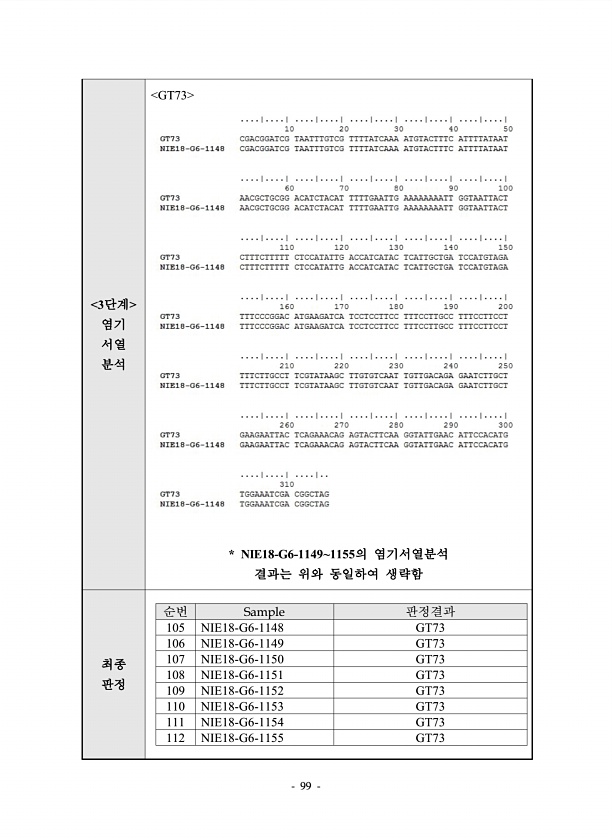 99 3단계 염기 서열 분석 GT73 * NIE18-G6-11491155의 염기서열분석 결과는 위와 동일하여 생략함 최종 판정 순번 Sample 판정결과 105 NIE18-G6-1148 GT73 106 NIE18-G6-1149 GT73 107 NIE18-G6-1150 GT73 108 NIE18-G6-1151 GT73 109 NIE18-G6-1152 GT73 110 NIE18-G6-1153 GT73 111 NIE18-G6-1154 GT73 112 NIE18-G6-1155GT73