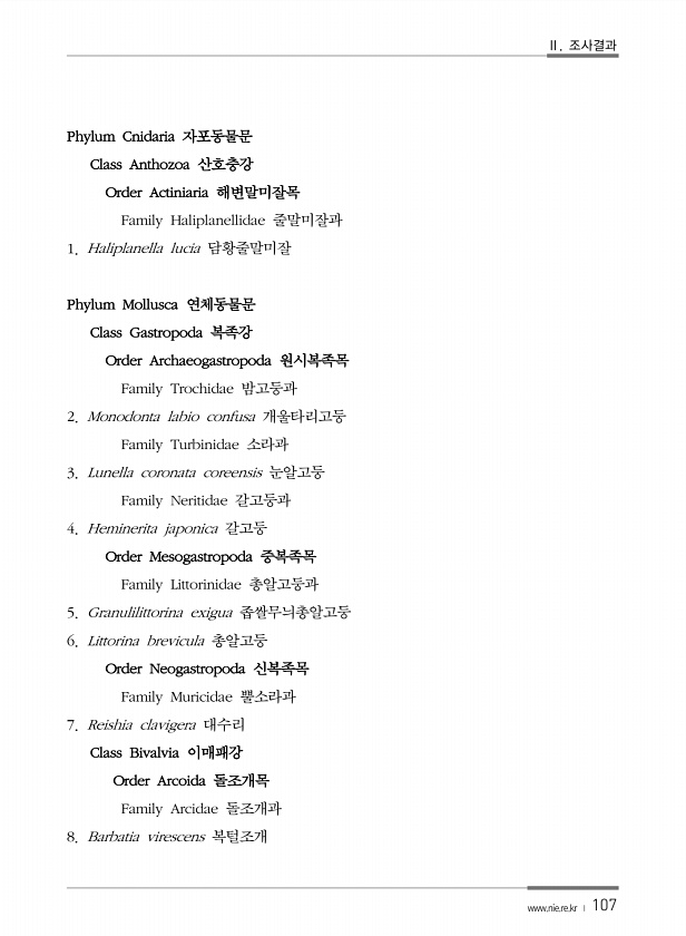Ⅱ. 조사결과 www.nie.re.kr ? 107 Phylum Cnidaria 자포동물문 Class Anthozoa 산호충강 Order Actiniaria 해변말미잘목 Family Haliplanellidae 줄말미잘과 1. Haliplanella lucia 담황줄말미잘 Phylum Mollusca 연체동물문 Class Gastropoda 복족강 Order Archaeogastropoda 원시복족목 Family Trochidae 밤고둥과 2. Monodonta labio confusa 개울타리고둥 Family Turbinidae 소라과 3. Lunella coronata coreensis 눈알고둥 Family Neritidae 갈고둥과 4. Heminerita japonica 갈고둥 Order Mesogas...
