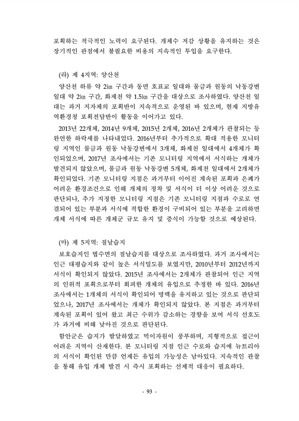 93 포획하는 적극적인 노력이 요구된다. 개체수 저감 상황을 유지하는 것은 장기적인 관점에서 불필요한 비용의 지속적인 투입을 요구한다. 라 제 4지역양산천 양산천 하류 약 2㎞ 구간과 동면 호표교 일대와 물금과 원동의 낙동강변 일대 약 2㎞ 구간, 화제천 약 1.5㎞ 구간을 대상으로 조사하였다. 양산천 일 대는 과거 지자체의 포획반이 지속적으로 운영된 바 있으며, 현재 지방유 역환경청 포획전담반이 활동을 이어가고 있다. 2013년 22개체, 2014년 9개체, 2015년 2개체, 2016년 2개체가 관찰되는 등 완연한 하락세를 나타내었다. 2016년부터 추가적으로 확대 적용한 모니터 링 지역인 물금과 원동 낙동강변에서 3개체, 화제천 일대에서 4개체가 확 인되었으며, 2017년 조사에서는 기존 모니터링 지역...