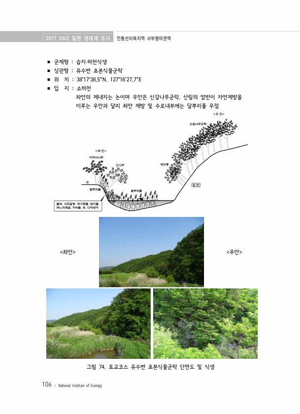 2017 DMZ 일원 생태계 조사 민통선이북지역 서부평야권역 106 ? National Institute of Ecology ■ 군계형 습지·하천식생 ■ 상관형 유수변 초본식물군락 ■ 위 치 38°17′38.5″N. 127°16′27.7″E ■ 입 지 소하천 좌안의 제내지는 논이며 우안은 신갈나무군락. 산림의 암반이 자연제방을 이루는 우안과 달리 좌안 제방 및 수로내부에는 달뿌리풀 우점 좌안 우안 그림 74. 토교코스 유수변 초본식물군락 단면도 및식생
