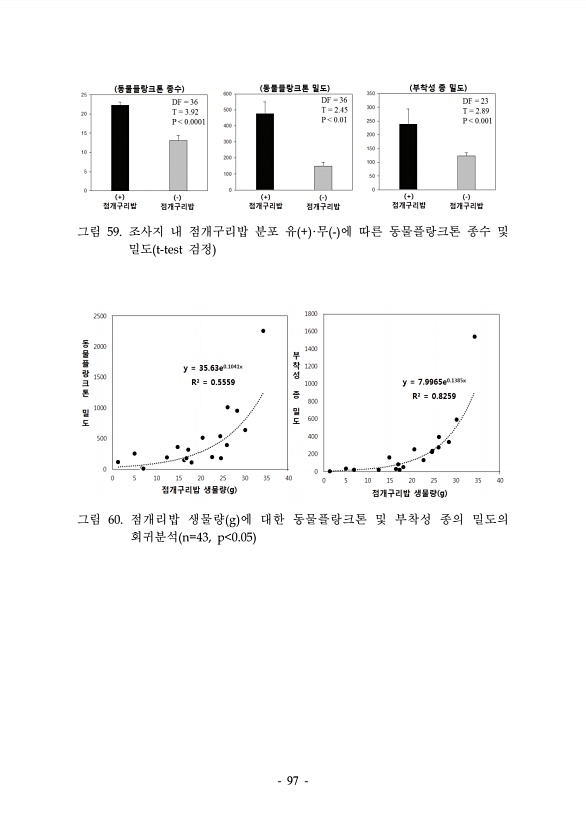 97 그림 59. 조사지 내 점개구리밥 분포 유 + ·무 에 따른 동물플랑크톤 종수 및 밀도 t-test 검정 그림 60. 점개리밥 생물량 g 에 대한 동물플랑크톤 및 부착성 종의 밀도의 회귀분석 n=43, p 0.05