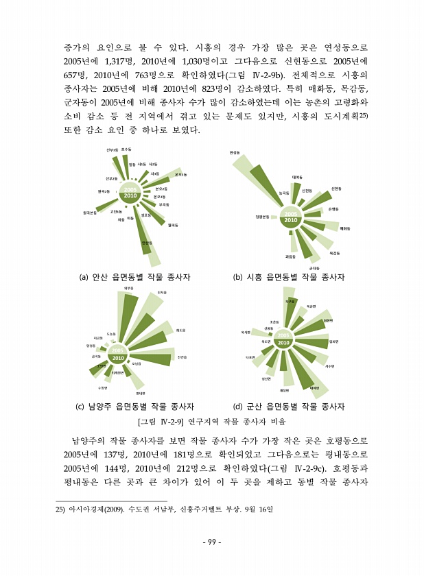 증가의 요인으로 불 수 있다. 시흥의 경우 가장 많은 곳은 연성동으로 2005년에 1,317명, 2010년에 1,030명이고 그다음으로 신현동으로 2005년에 657명, 2010년에 763명으로 확인하였다 그림 Ⅳ-2-9b 전체적으로 시흥의 종사자는 2005년에 비해 2010년에 823명이 감소하였다. 특히 매화동, 목감동, 군자동이 2005년에 비해 종사자 수가 많이 감소하였는데 이는 농촌의 고령화와 소비 감소 등 전 지역에서 겪고 있는 문제도 있지만, 시흥의 도시계획25 또한 감소 요인 중 하나로 보였다. a 안산 읍면동별 작물 종사자 b 시흥 읍면동별 작물 종사자 c 남양주 읍면동별 작물 종사자 d 군산 읍면동별 작물 종사자 [그림 Ⅳ-2-9] 연구지역 작물 종사자 비율 남양주의 작물 종사자를 보면 작...
